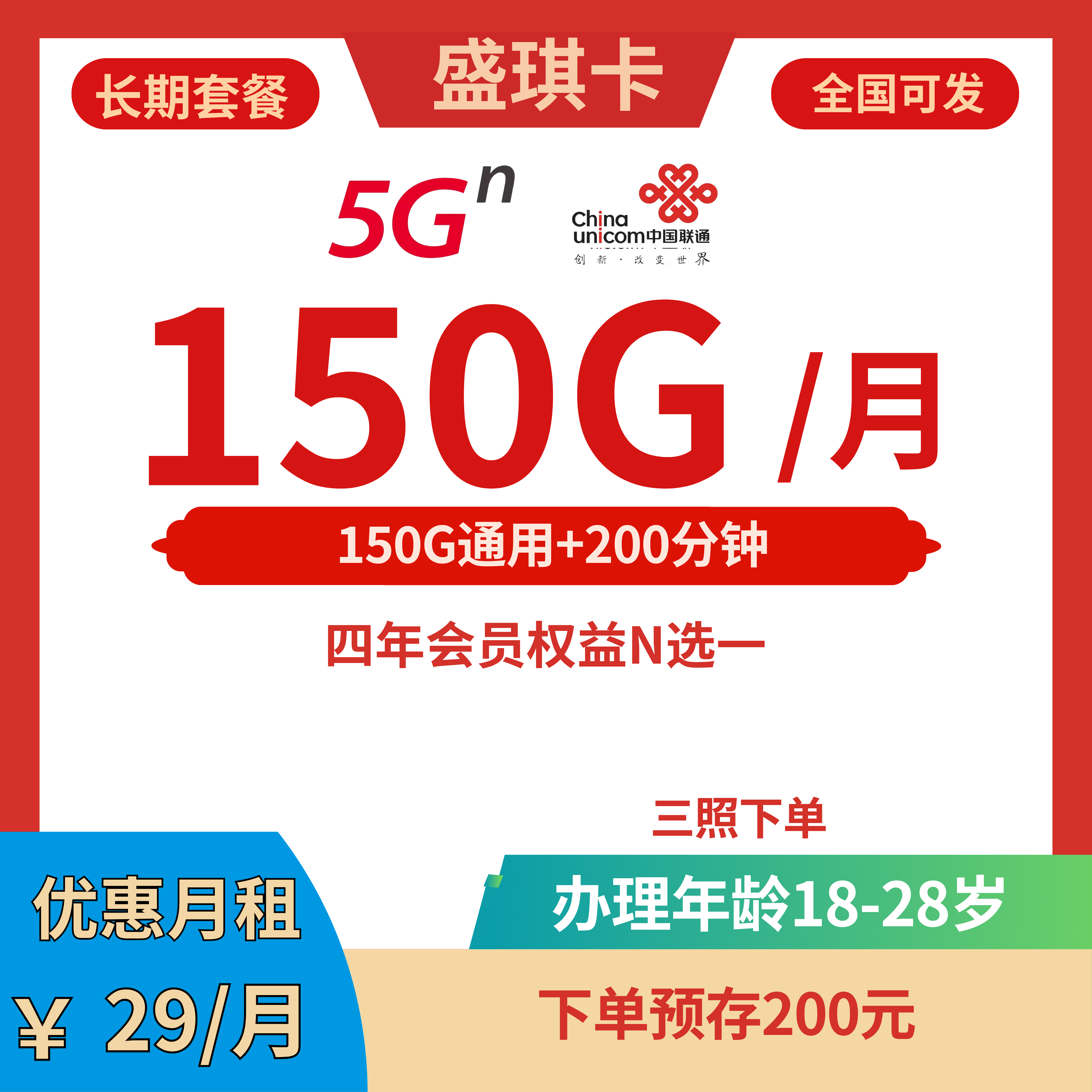 MF联通盛琪卡29元150G通用+200分钟+会员【发全国】