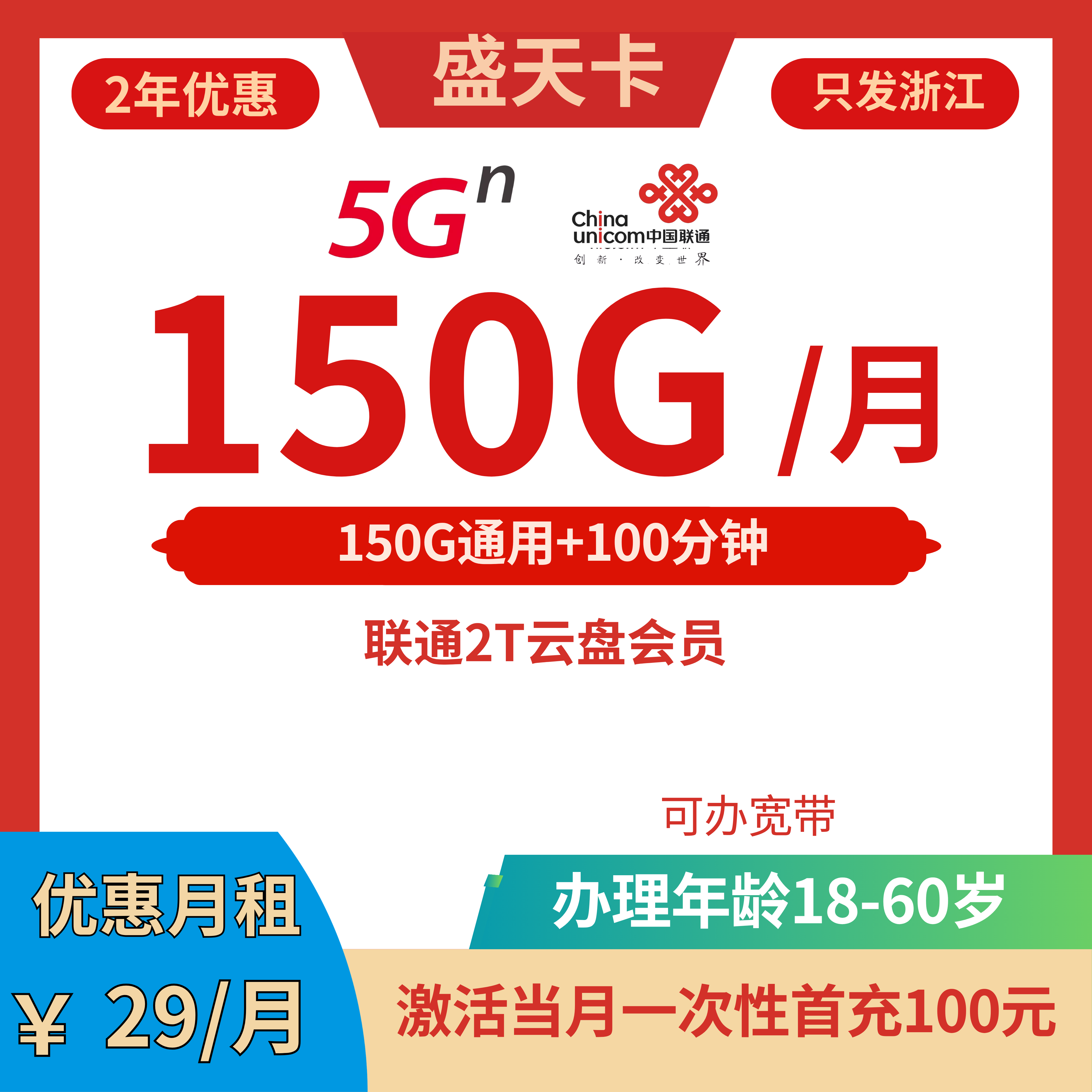 联通盛巧卡29元150G通用+100分钟【发全国】